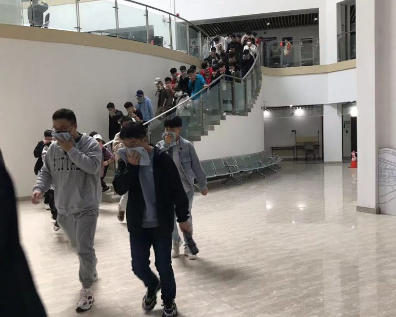 本次消防逃生演练模拟了8B325实验室发生火灾,师生紧急疏散。演练开始前保卫处吴挺老师给全体师生进行了简短的安全教育,指出了实验室目前存在的一些安全问题,近年来部分高校出现的安全事故,目前学院实验室常见的安全隐患,比如电瓶车实验室内充电、插排串接、违章电器等,同时讲解了灭火器等消防设备的使用方法。演练开始后,各楼层导护教师协助安抚稳定学生情绪,指导帮助学生做出正确逃生姿势。消防逃生过程紧张、有序,师生们用湿毛巾捂住口鼻,弯腰小步快走,按照预定的安全路线进行有序撤离。