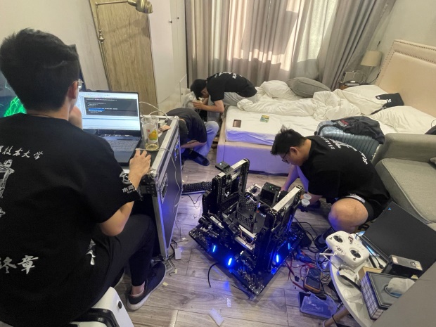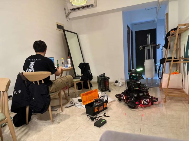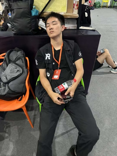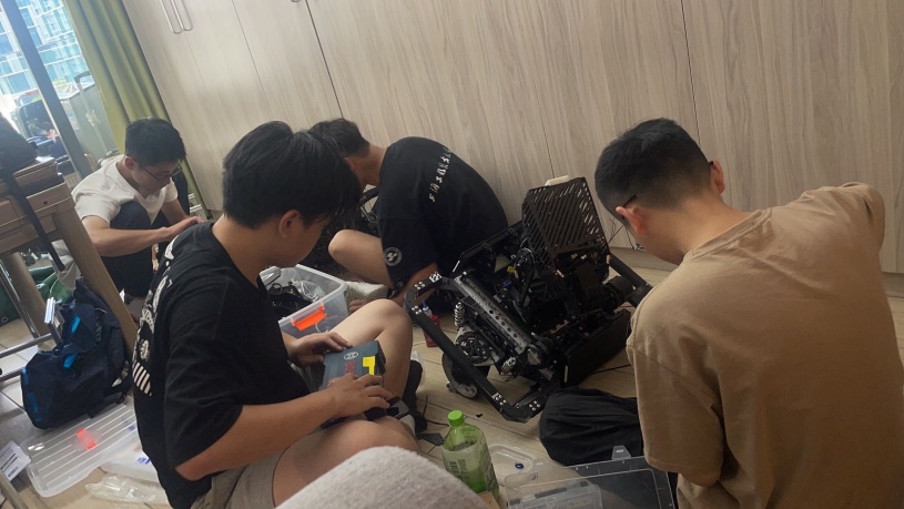 比赛过程中,全队上下齐心协力、昼夜不停、披星戴月地对机器调试。参赛的师生不顾19个小时绿皮火车的舟车劳顿,一到宾馆就开始各种兵种的检查、调试;为了节约差旅,战队的8个姑娘自带睡袋挤在一个2人间中打地铺;为了让机器性能能尽快适应场地参数,队长深夜带着大家到友校