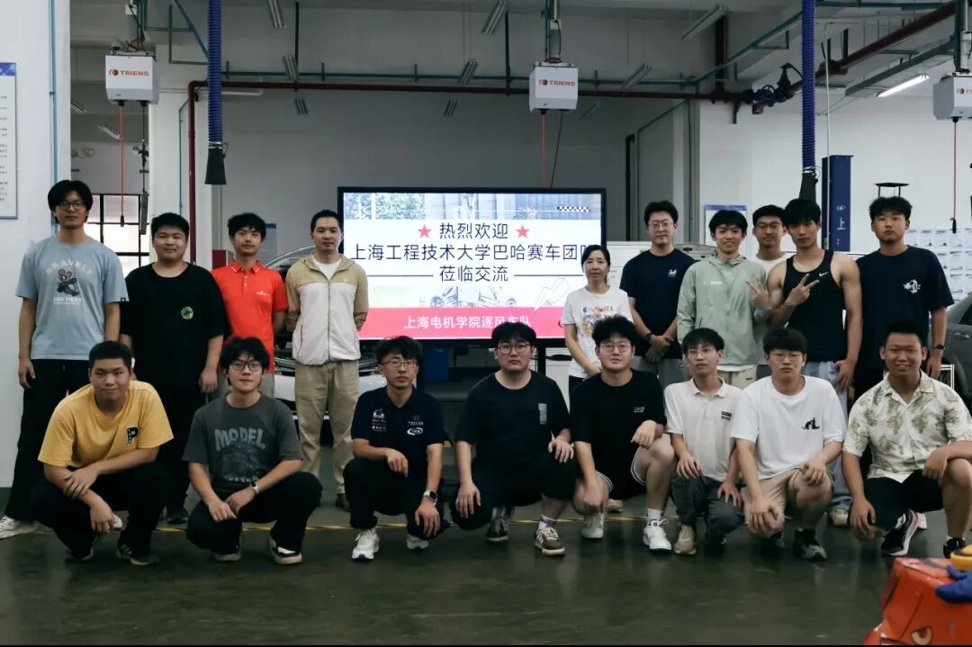 近日,龙腾巴哈车队队员在指导老师的带领下,前往上海电机学院逐风车队进行交流学习。