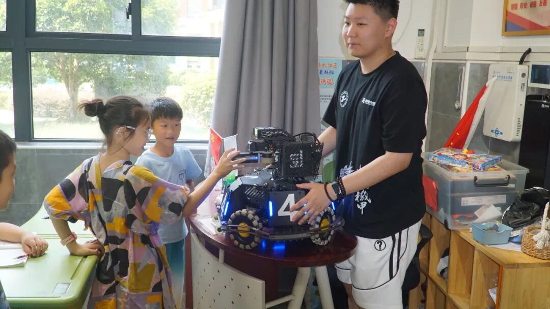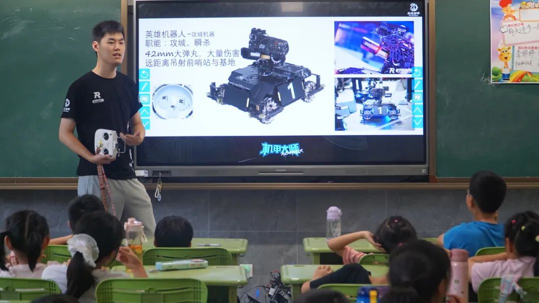 活动中,作为一支曾在赛场上击败上海交通大学,哈尔滨工业大学等高校,荣获RoboMaster机甲大师赛分赛区冠军等荣誉的队伍,队员们首先向同学们介绍了战队的文化与精神,包括战队口号中扶摇直上的美好愿景和战至终章的拼搏精神。随后,队员们为同学们生动地讲解了机甲大师赛中各类机器人的设计理念与原型灵感。秉承着“因材施教、寓教于乐”的教学理念,队员们将机器人带到孩子们身边,鼓励近距离互动体验。孩子们亲手触摸、亲眼观察,兴奋与好奇洋溢在面孔上。这种沉浸式的感知点燃了他们对机器人的浓厚兴趣,激发其动手探索的强烈欲望。