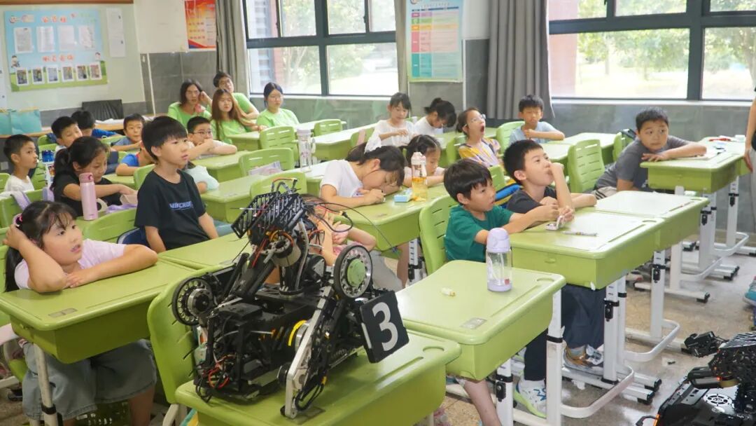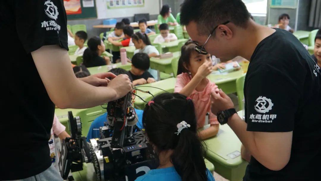 7月14日,上海工程技术大学木鸢Birdiebot战队应邀派出五名队员,携全向轮步兵、英雄机器人及轮腿步兵机器人三台机器人,走进华东政法大学附属松江实验学校小学生爱心暑托班,以科普机器人基础知识,宣传机甲大师赛事为核心目的,开展了一场别开生面的机器人科普教育活动。RoboMaster机甲大师赛是由大疆创新发起并承办的面向全球高校的机器人竞技赛事,以机器人对抗为核心形式,要求参赛队伍自主研发包括步兵、英雄等多种机器人,在复杂战场中进行战术对抗,是融合机械、电控、算法、硬件等前沿技术的高水平竞技平台。